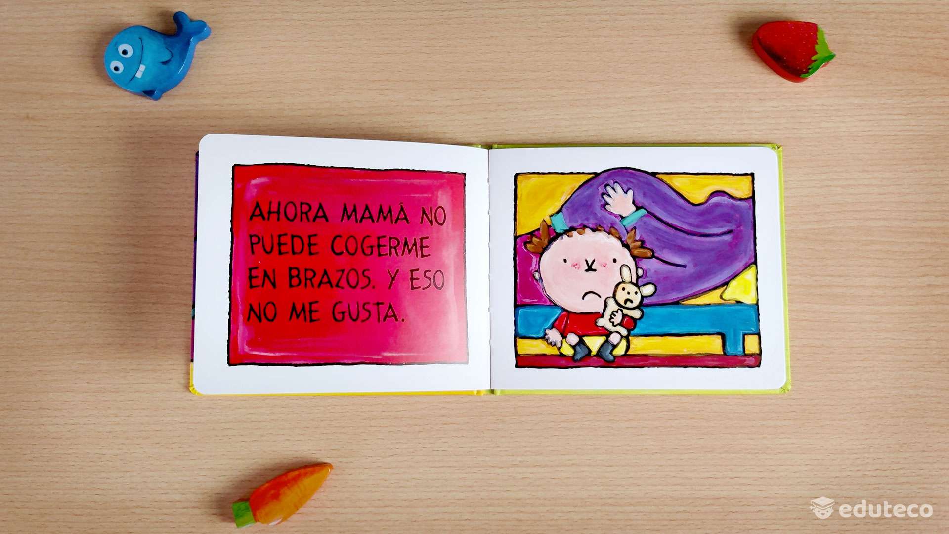 Las molestias del embarazo también están presentes: a veces Laura no puede jugar con mamá, a veces mamá no puede cargarla. Son los momentos en los que Laura se siente un poco enojada. El mayor desplazamiento ocurre cuando está por nacer el bebé, ya que su papá la lleva a casa de la abuela a pasar allí unos días.